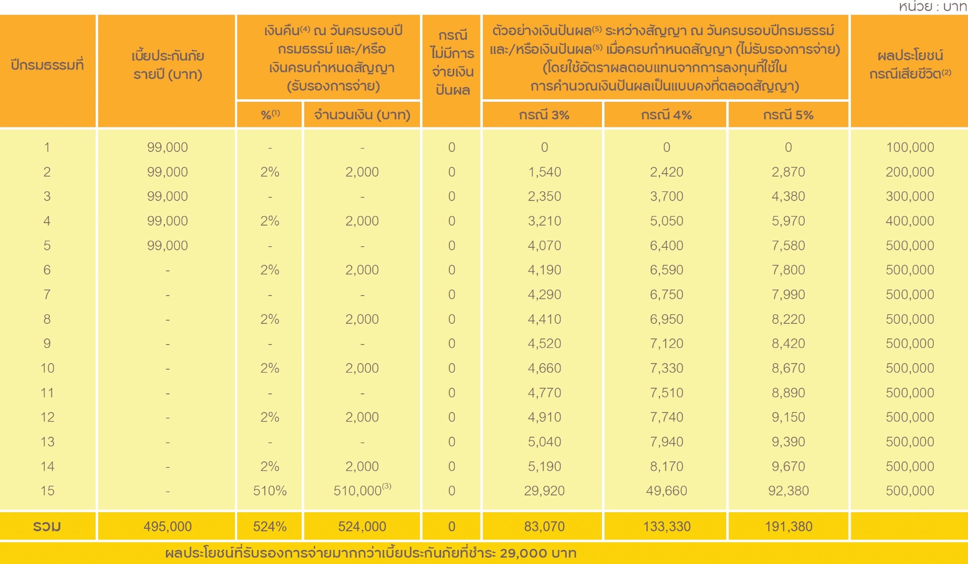 - - เพื่อสิทธิประโยชน์สูงสุดของท่าน ควรถือกรมธรรม์จนครบกำหนดสัญญา และผลประโยชน์ที่ได้รับจากกรมธรรม์ประกันชีวิตจะไม่มีการหักภาษีใดๆ ทั้งสิ้น และเป็นเงินปลอดหนี้ เจ้าหนี้ไม่มีสิทธิ์ยึดได้ ยกเว้นเท่าจำนวนเบี้ยประกันภัยที่จ่ายไปเท่านั้น